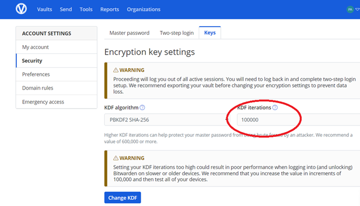 Key Settings” screen, change the value of “KDF Iterations”