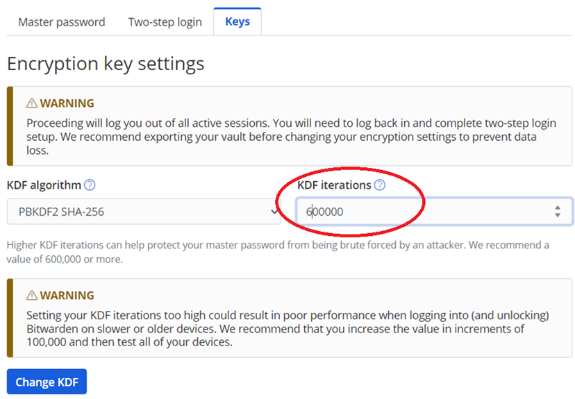 Setting your KDF iterations too high could result in poor performance when logging into (and unlocking) Bitwarden on devices with slower CPUs. We recommend increasing the value in increments of 100,000.