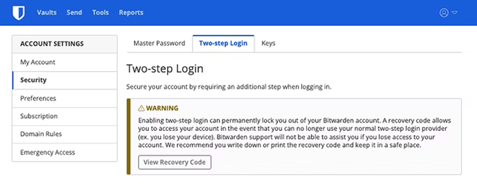 Click the View Recover Code button in the Warning box, and enter your Master Password when prompted. This will display a 32-character code, which you should print out or write down in a secure location (e.g., your Bitwarden Emergency Sheet).