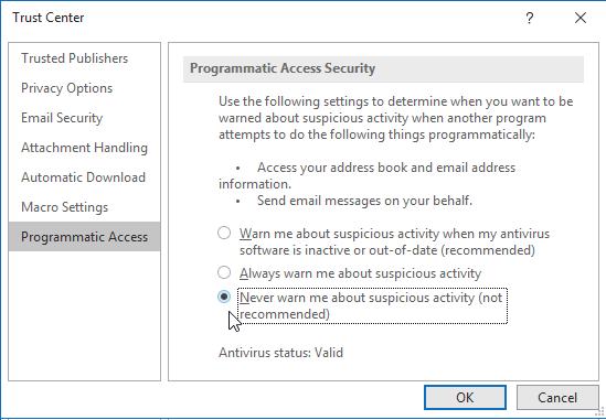 The simplest method to allow programmatic access to Outlook is through the Outlook Trust Center.