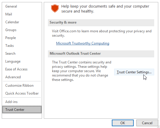When corporate group policy prevents changing settings in the Outlook Trust Center, the alternative is to enable programmatic access to Outlook through the registry.