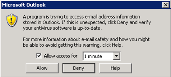However, Outlook security settings may block access to those functions. Depending on the version of Outlook installed, the message below might be displayed.