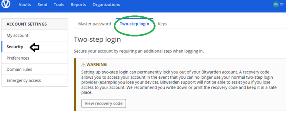 Get your recovery code from the Two-step login screen immediately after enabling any method.