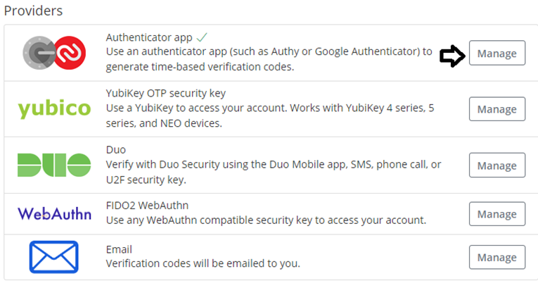 4, Locate the Authenticator App option and select the Manage button: