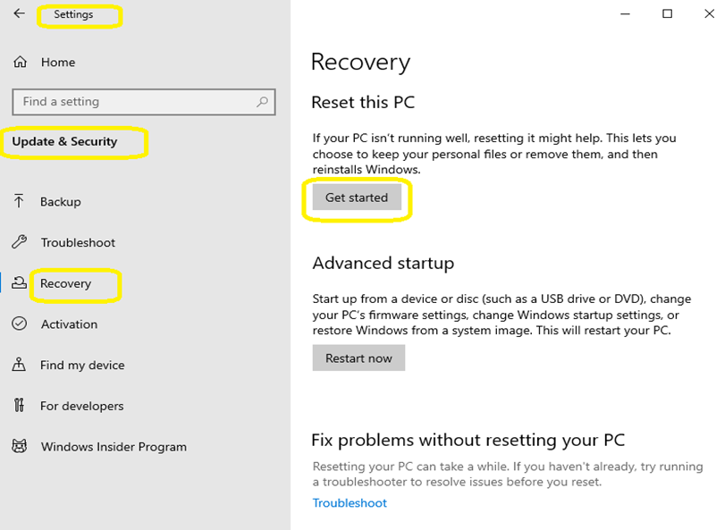 Open "Settings", "Update and Security", "Recovery" and click "Get started" button under