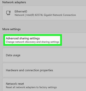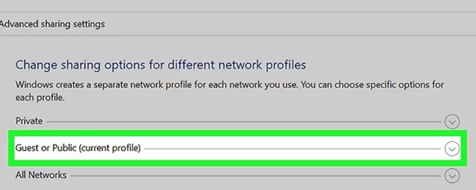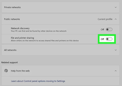 Advanced sharing settings. Select your network, then toggle off “File and