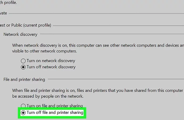 6.Select Turn off file and printer sharing. A dot will appear in its corresponding